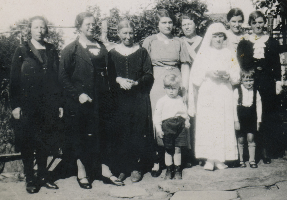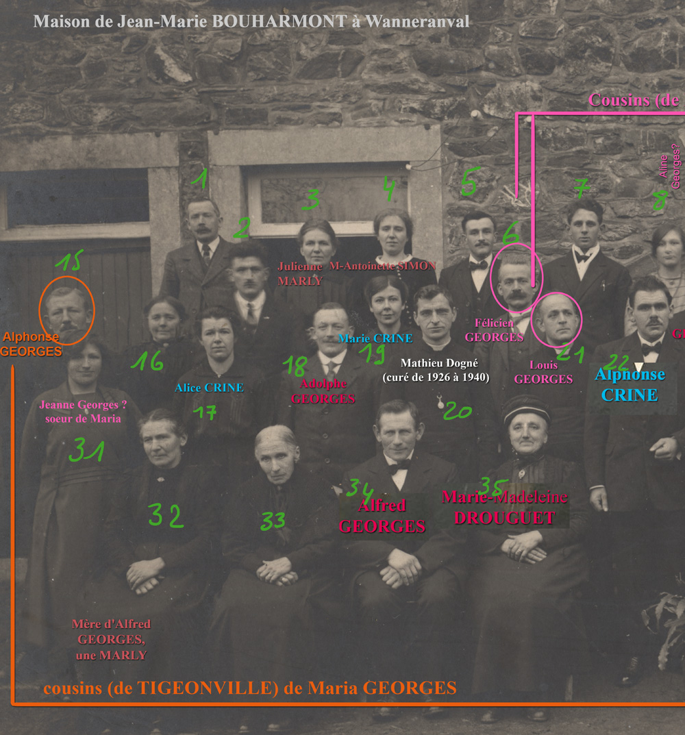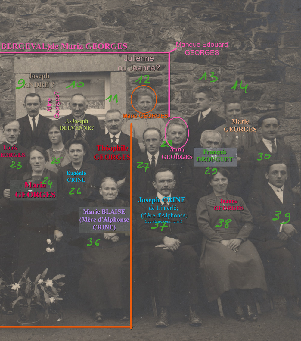 | 1 2 3 Julienne MARLY, sur du 32 (= tante d'Alfred GEORGES), mère de la suivante 4. 4 Marie-Antoinette SIMON 5 6 Félicien GEORGES (frère de Louis 21 et d'Anna 28) de BERGEVAL 7 8 9 Joseph ANDRÉ ? 10 : Pourrait être J.-Joseph DELVENNE de Wanneranval, époux ou veuf de Marie Madeleine GÉRION et cousin de Marie Madeleine (et François ) DROUGUET. Il était le père de Théophile, Julie et Marie Delvenne 11Théophile GEORGES (oncle de Maria, frère d'Alfred) 12 Marie GEORGES (cousine de Maria), de TIGEONVILLE 13 14 Marie GEORGES (cousine de Maria) d'Ennal, sans enfant 15 Alphonse GEORGES de TIGEONVILLE, frère de Marie GEORGES. Son père s'appelait Alphonse. 16 17 Alice CRINE, soeur d'Alphonse CRINE 18 Adolphe GEORGES, frère de Maria, Avait épousé une Lucie ANDRÉ de Retigny, père de J-Marie Gorges 19 Marie CRINE, soeur d'Alphonse CRINE 20 Curé Mathieu DOGNÉ 21 Louis GEORGES, frère d'Anna (28), de Bergeval, doyen d'Houffalize à l'Offensive. Curé à Limerlé. 22 Alphonse CRINE, le marié 23 Louis GEORGE, frère de Maria, curé de Solwaster 24 Maria GEORGES, la mariée 25 Une Aline Georges mariée à un ANDRÉ ? 26 Eugénie CRINE (soeur d'Alphonse CRINE) 27 28 Anna GEORGES, cousine germaine d'Alfred GEORGES, de Bergeval 29 François DROUGUET (frère de Marie-Madeleine DROUGUET) 30 31 32 Mère d'Alfred GEORGES, une MARLY 33 34 Alfred GEORGES (père de Maria GEORGES) 35 Marie-Madeleine DROUGUET (mère de Maria GEORGES) 36 Marie BLAISE (mère d'Alphonse CRINE) 37 38 Jeanne GEORGES sur de Maria (célibataire, vivait avec Louis, Curé de Solwaster) 39 40 41 42 Sources : |